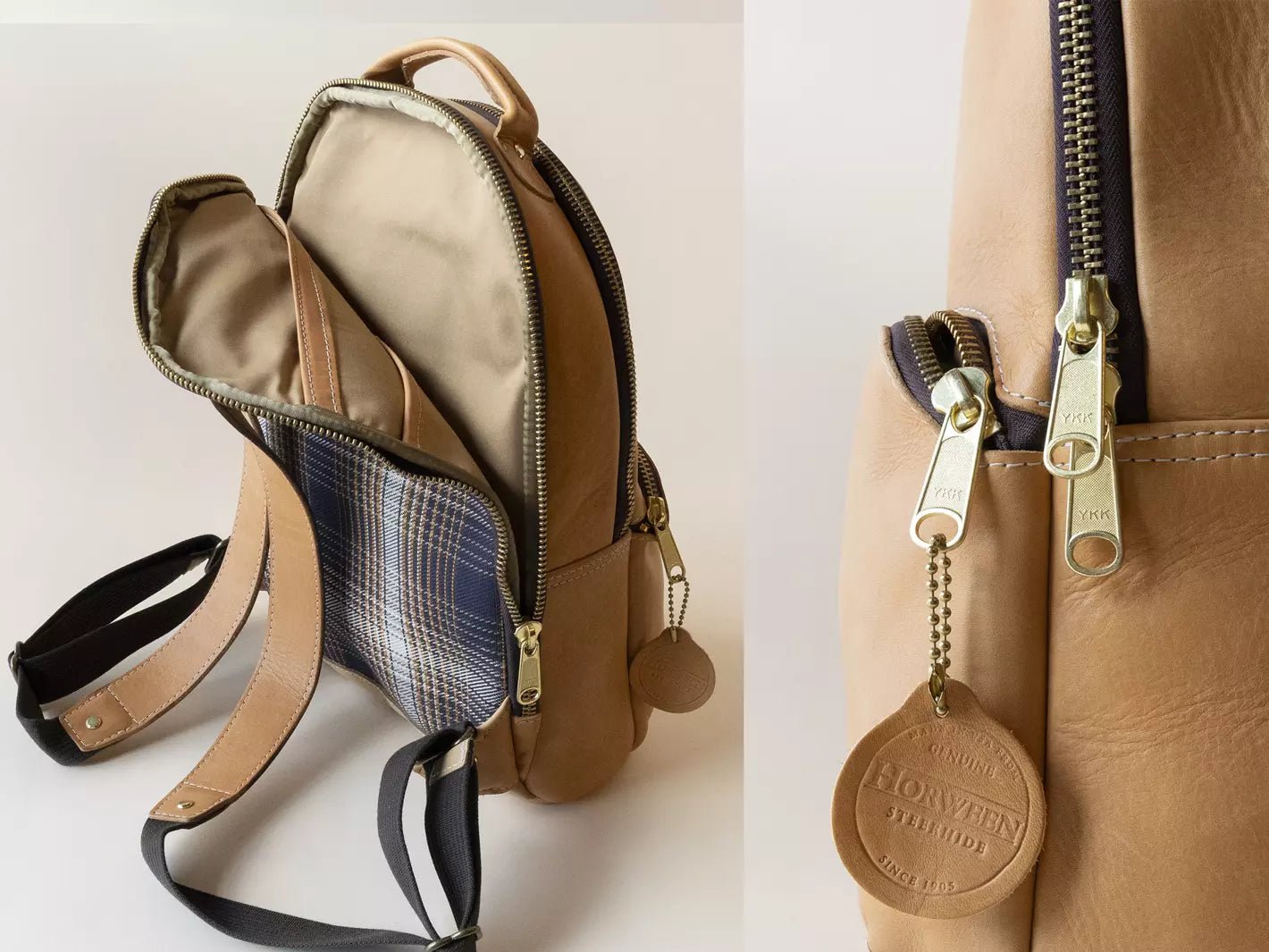 Designed for modern professionals, this premium leather backpack features a reinforced back panel made from heavyweight Japanese plaid shirting. Two full-zip compartments allow for easy access and built-in organization, with a gusseted front pocket for extra storage. Double-layered leather straps with Belgian cotton webbing offer comfort and durability. Designed by Coronado Leather and made in the USA.
